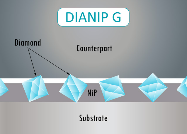金剛石涂層是由單晶金剛石和化學(xué)鎳基體組成,DIANIP涂層嵌入的金剛石顆粒尺寸非常均勻一致。涂層功能性主要取決于嵌入涂層金剛石顆粒的尺寸。涂層功能主要體現(xiàn): 硬度、磨損性能、摩擦性能、配合性、尖銳化。單晶金剛石顆粒尺寸的完美選擇和定義使得涂層表面形貌非常規(guī)則,涂層定義明確化。共沉積和涂層是通過(guò)化學(xué)方法進(jìn)行,這種方法可以完成完全規(guī)則厚度的表面涂層,而不受基體邊緣尺寸的影響,并且在復(fù)雜表面的狹小尺寸處也能完好的進(jìn)行涂層并沉積金剛石顆粒。涂層可以保證金剛石顆粒60%的尺寸嵌入鎳涂層, 金剛石在涂層中牢固錨定。此外,DIANIP技術(shù)還允許在化學(xué)鎳的基體中引入高比重含有小粒徑(約3μm)的金剛石顆粒,生產(chǎn)出極為耐磨的復(fù)合涂層